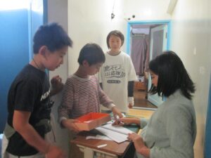 まず部屋のサイズを測って図面を書きました。部屋のサイズを測るのがすごく大変でしたが、みんなで頑張りました。パーテーション木の板、布などの壁になるものを何処に置くかを考え、図面に書きました。布は、天井にワイヤーを張って、そこにクリップを付けて吊るす方式にして、コースの変更も出来る様にしました。のびフェス当日は、一日に2~3回程コースの変更を行いました。本番中に布がクリップから外れて、布が落ちてしまったり、行き止まりを人が通ってしまったりして大変でしたが、皆さんが沢山来てくれたので、2日目に売ったミサンガの売り上げも込みで全売り上げは10,600円でした。飲食店以外では、比較的頑張ったほうだと思います。
